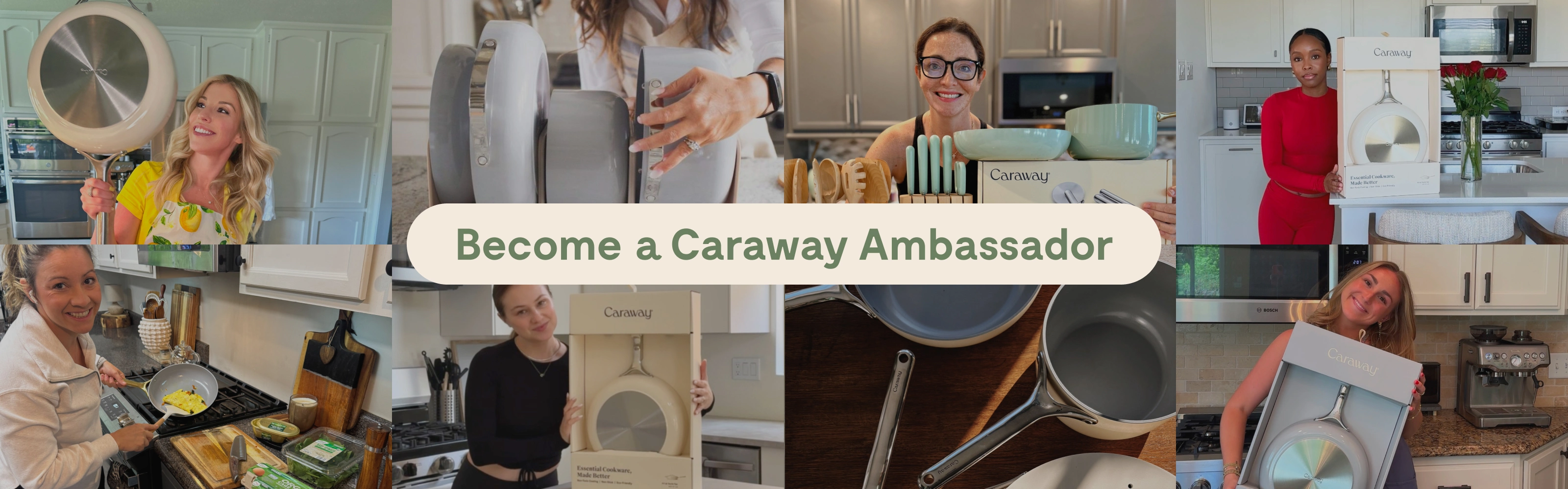 Our Ambassador Program is designed for creators with 10k+ followers who are interested in an ongoing partnership with Caraway. Ambassadors receive free product, early access to launches, and are eligible for features, events, and more.
