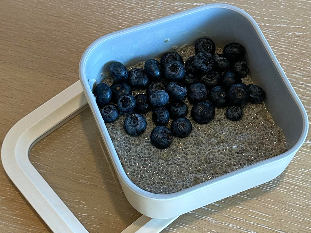 Mix ingredients in Caraway’s Small Food Storage Container. Let sit for 10 minutes, then mix again to break up any clumps. Refrigerate overnight. Top with fruit and granola before serving.