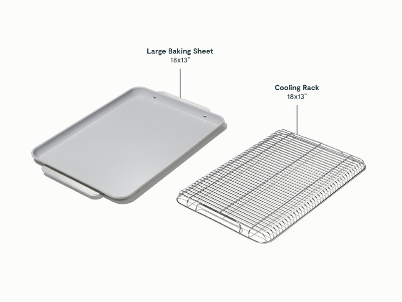 Roast, cool, and garnish with the Caraway Large Baking & Cooling Duo. Featuring our 18x13" Large Baking Sheet and Cooling Rack, this essential pair is perfect for cooling baked goods, roasting proteins, and mess-free decorating. Thoughtfully crafted without PTFE, PFOA, and PFAS, our proprietary non-stick ceramic coating offers effortless baking, easy cleanup, and peace of mind at every meal.