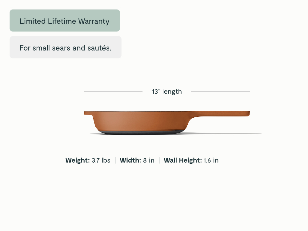 Cook conveniently with Caraway’s 8” Enameled Cast Iron Mini Skillet—lightweight, durable, and intentionally sized for smaller servings. Featuring a 3-layer, non-toxic enamel coating, this compact skillet delivers exceptional heat retention, even cooking, and effortless cleanup—for a lifetime of versatile, flavorful meals.
