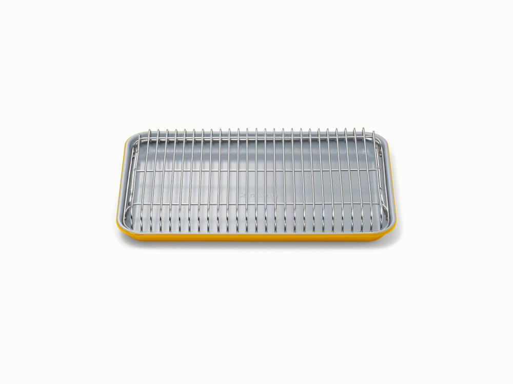 Roast, cool, and garnish conveniently with the Caraway Small Baking & Cooling Duo. Featuring our 13x9" Small Baking Sheet and Cooling Rack, this compact pair is perfect for cooling small-batch baked goods, roasting proteins for 1-2 people, and mess-free decorating. Thoughtfully crafted without forever chemicals, our proprietary non-stick ceramic coating offers effortless baking, easy cleanup, and peace of mind at every meal.