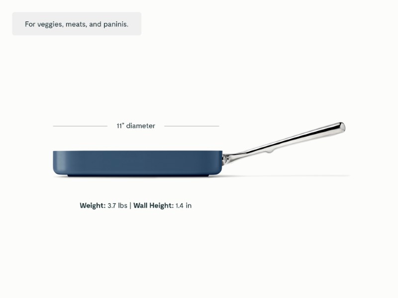 Bring backyard favorites inside with Caraway’s 11” Ceramic-Coated Square Grill Pan. With 50% more cooking space than our classic Fry Pan, this spacious essential is perfect for kebabs, barbecue, paninis, and more. Thoughtfully crafted without PTFE, PFOA, and PFAS, our proprietary non-stick ceramic offers effortless cooking, easy cleanup, and peace of mind at every meal.